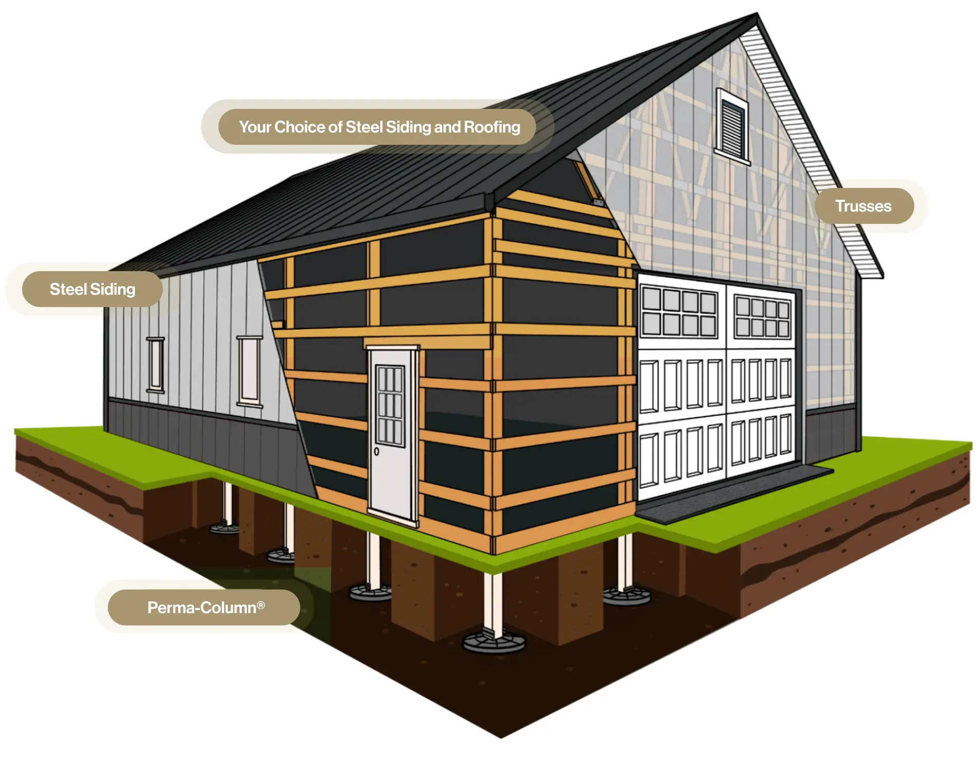 These columns form a rigid connection with the ground by using either a precast concrete Perma-Column or cast-in-place foundation such as a frost wall or engineered slab. This creates a stiff interlocking frame that can support walls up to 26 feet in height.